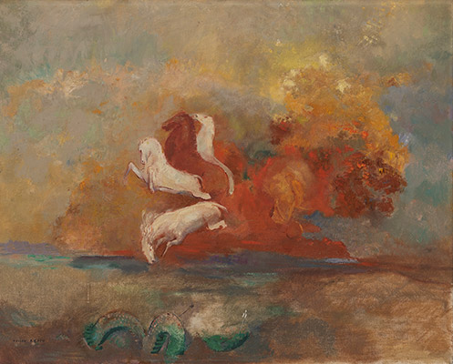 印象派の画家たちとほぼ同世代のルドンですが、目に映る、移ろいゆく現実の光景を描いた印象派に対し、ルドンは自身が幻視した世界を描きました。石版画集の刊行など、当初は文学者たちからの注目をあつめたルドンですが、やがて、若手の画家や、収集家らとの新しい出会いを通して、画風や使う色彩を変化させていきました。前半生に集中的に作成した木炭画や版画から、後半生のパステルや油彩まで、変貌するルドンの世界をお楽しみください。